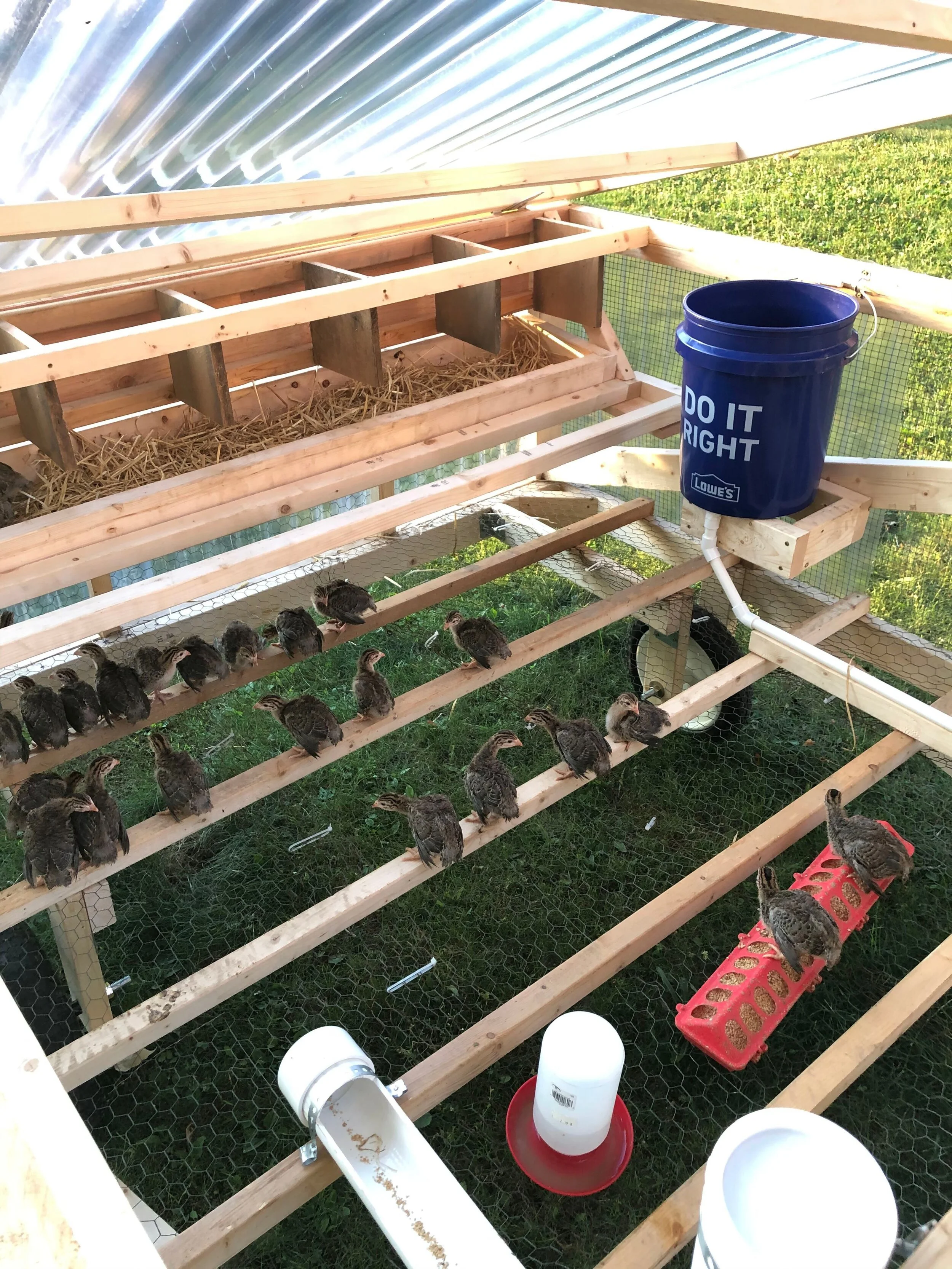 The trickiest part of this project was getting the birds to return to the coop each evening. At this point, the little velociraptors were too agile to easily catch by hand. With the help of my old man, we developed an approach to herding them back into the coop. We lowered the front door, offering a ramp for the birds to walk back into the coop. The two of us were each armed with two ruler-length sticks to herd the birds. One of us stood a few feet from the front door. The second person then walked in a circle from the back of the coop towards the front of the coop, using their sticks as guardrails to nudge the birds towards the front. As the birds near the front door, both of you now need to use your sticks to block all possible paths, leaving no option for the birds other than to walk up the ramp into the coop. This was a bit of circus for the first few week or two. It took us dozens of tries at first. The birds slowly became more comfortable with this process, and we developed a bit of a skill, so soon we were able to herd the birds back into the coop with just one or two laps around the coop.