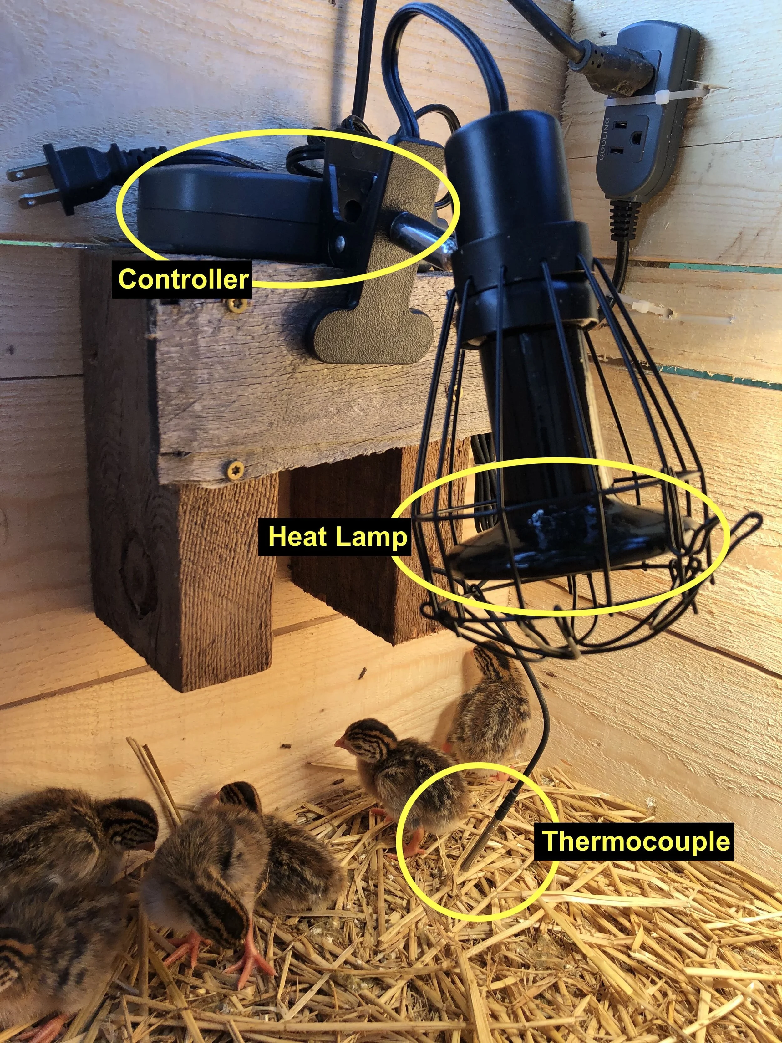 The thermocouple is just an electronic thermometer. Position this little metal sensor roughly in the middle of your brooder. Follow the directions provided in the kit to set your system’s target temperature to 95 degrees (for the first week).