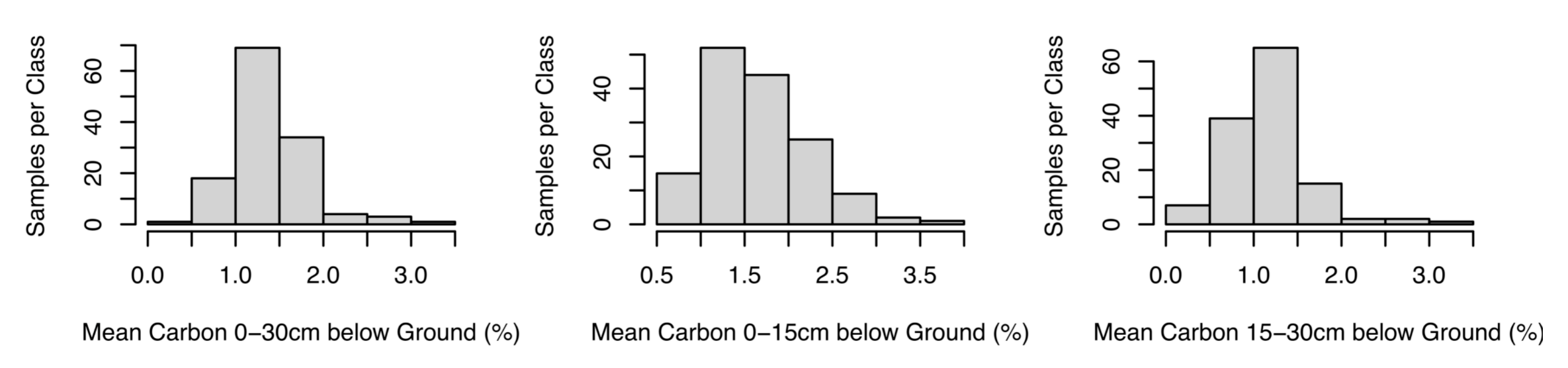 Figure 1: Histogram of data across sampled soil depths, provided by the Skidmore team.