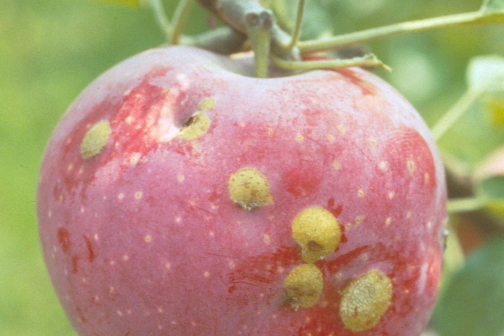 Fly Speck is a fungal disease that covers the apple peel with clusters of dark freckles. The freckled peel has no impact on the taste or texture of the apple. It can be eaten as normal, directly from the tree!